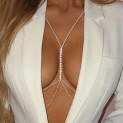 Produktdetails: Unsere Bauch-Halskette ist ein elegantes Schmuckstück, das deine Taille und dein Dekolleté betont. Die feinen Ketten in Gold oder Silber geben deinem Look eine subtile, aber beeindruckende Note. Mit funkelnden Strasssteinen zwischen der Brust ist sie ein perfektes Accessoire für jeden Anlass.