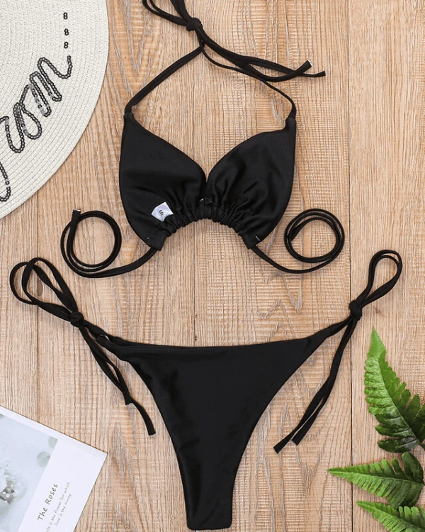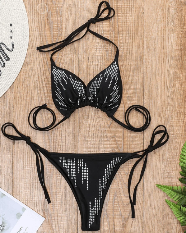 Produktdetails: Elegantes schwarzes Bikini. Triangel Oberteil und Unterteil mit leichtem Brazil Schnitt und zum Schnürren. Schwarzes Bikini mit Glitzer Steinchen. Glitzer Black Bikini.