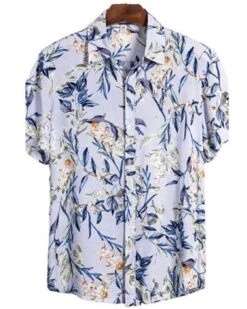 Produktdetails: Hellblaues fröhliches Herren Sommer Boho Hemd mit Kragen und kurzen Ärmeln. Männer Blusen Hemd mit Blumen Pflanzen Print Muster in blau Tönen. Vintage Flower Retro Herren Sommer Hemd.