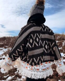 Produktdetails: Boho Ibiza Style Fashion Jacke in schwarz-beige mit Fransen und Ethno Raute Mustern. Stillvolle Hippie Jacke mit Kragen und ohne Verschluss auf der Vorderseite. Perfekte Übergangsjacke handgemacht aus Indien. Jacke in leichtem Oversize Schnitt und super stylisch.