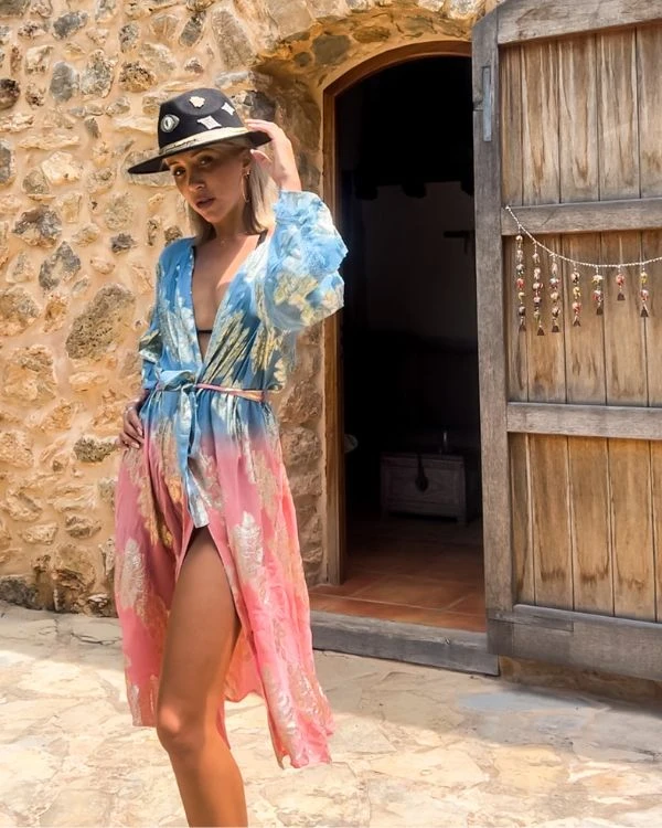 Produktdetails: Tauche ein in die faszinierende Welt unseres Kimonos in hellblau-rosa. Dieser halblange Kimono mit goldenen gestickten Details und einem farbigen Batik-Farbverlauf verleiht deinem Outfit einen Hauch von Romantik im Boho-Stil. Egal, ob du dich auf ein Festival, einen entspannten Boho-Look oder einen stilvollen Strandbesuch vorbereitest, dieser Kimono ist die perfekte Wahl. Mit dem Gurt zum Binden auf Taillenhöhe kannst du deinen eigenen Stil kreieren und dich in diesem wunderschönen Kimono rundum wohl fühlen. Geniesse den Zauber der Farben und strahle in diesem einzigartigen Kleidungsstück!