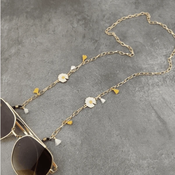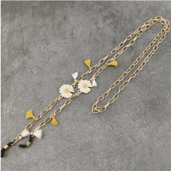 - Produktdetails: Brillenkette / Sonnenbrillenketten aus Gliederkette mit Gänseblümchen Anhängern und gelben Pompoms. Bohemian Brillenkette im Flower Power Style.