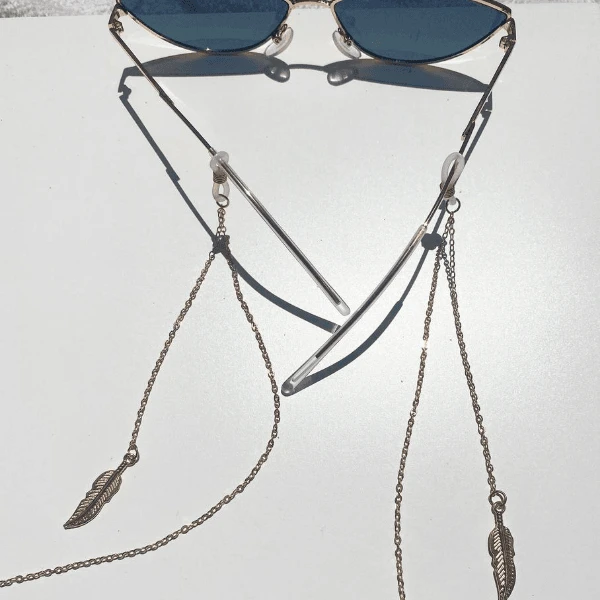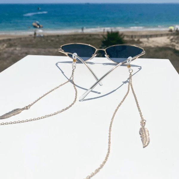 Produktdetails: Brillenkette / Sonnenbrillenketten mit zwei kleinen Federn auf der Seite in gold. Leichte und feine Brillenkette, perfekter Eye-Catcher.