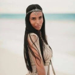 Produktdetails: Exklusiver Designer Kopfschmuck handgemacht in Ibiza. Boho Festival Style Kopfschmuck in silber mit echtem Mondstein. Hochwertiger Boho Gipsy Schmuck für um den Kopf mit schönen Mondstein Anhängern. Geflochtene Zöpfe um den Kopfschmuck um den Kopf zu binden.