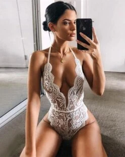 Produktdetails: Spitzen Dessous Bodysuit mit schönen Blumen Spitzen Lace Mustern. V-Ausschnitt und High-Waisted mit runden Mustern an den Seiten. Rückfreier verführerischer Spitzen Body, kann auf der Rückseite angepasst werden. Erotischer Lingerie Bodysuit für Damen.
