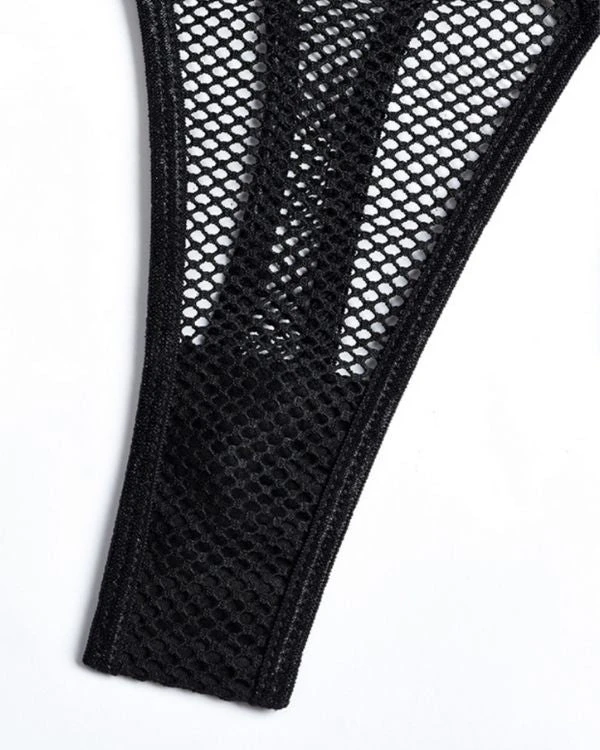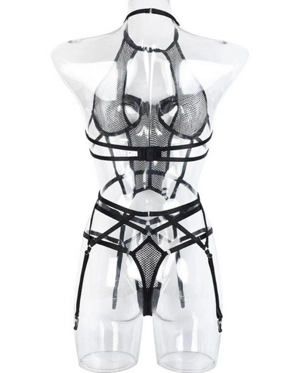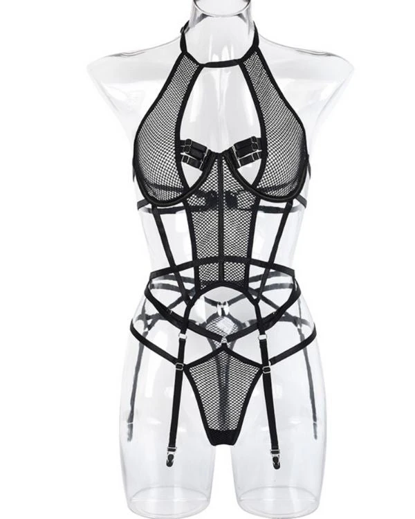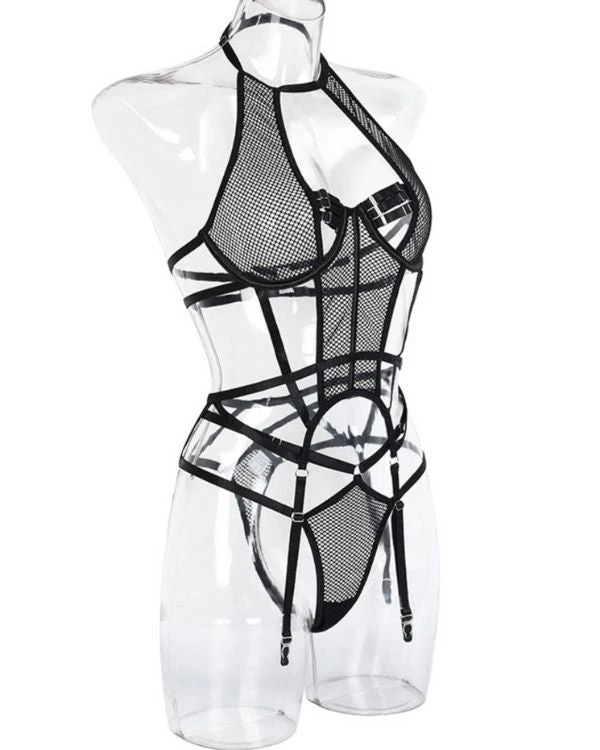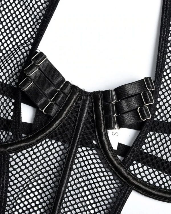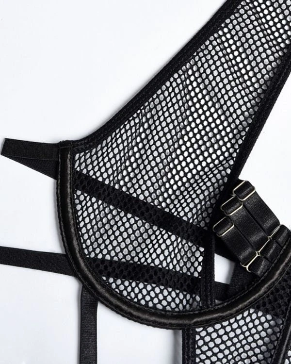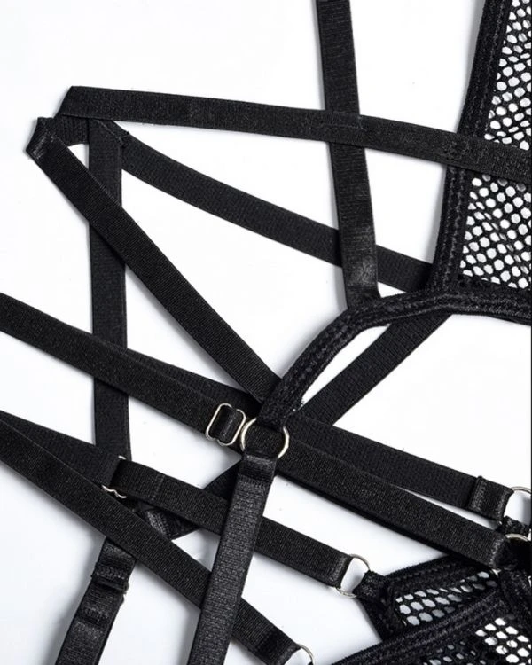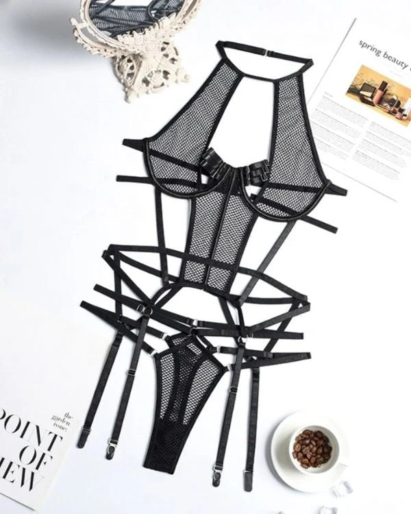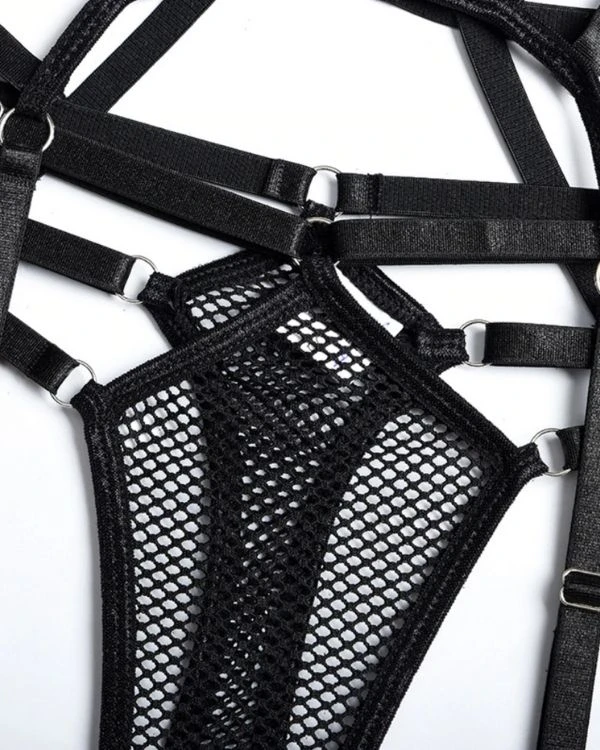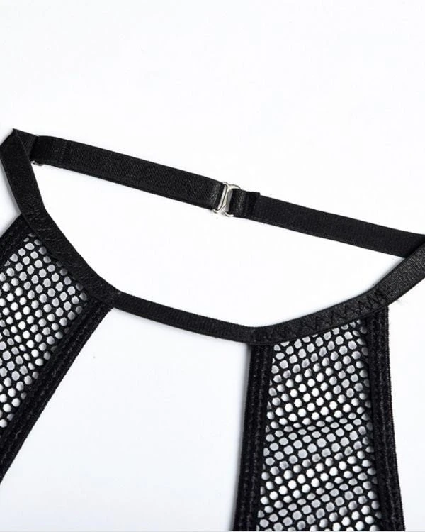 Produktdetails: Sinnlicher Bodysuit Dessous mit Strapsen Halterung und Neckholder. Bondage Style Erotik Dessous Body mit transparenten Netzteilen und verstellbaren Streifen und Haltern. Schwarzer sexy Netz Bodysuit für erotische Stunden.