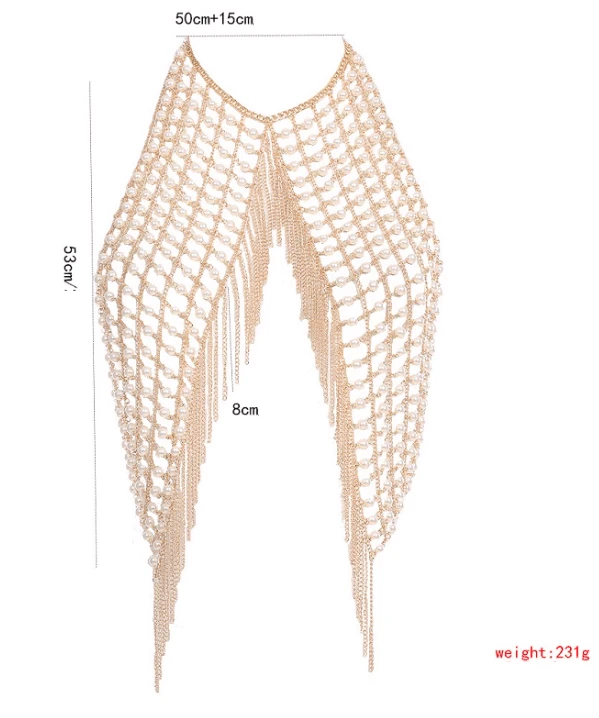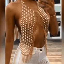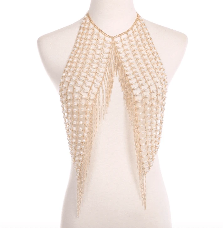 Produktdetails: Asymmetrischer Körperschmuck mit Perlen. Rückenfrei, deckt Brust ab. Perfektes Festival Accessoire.