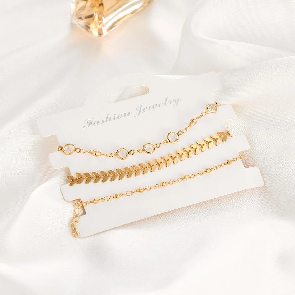 Produktdetails: Fussketten Set aus 3 diversen goldenen Modeschmuck Ketten. Eine Kette im Flechtmuster, sowie eine Kette mit transparenten Steinen und eine feine goldene Kette.