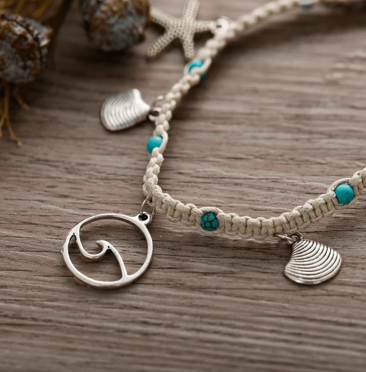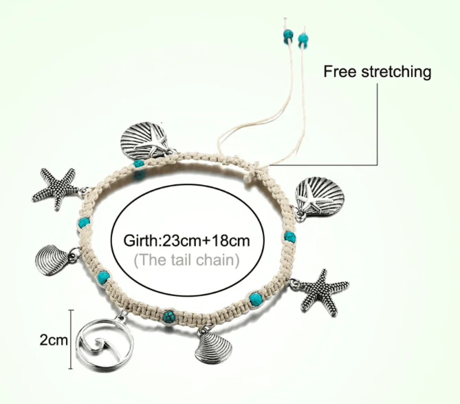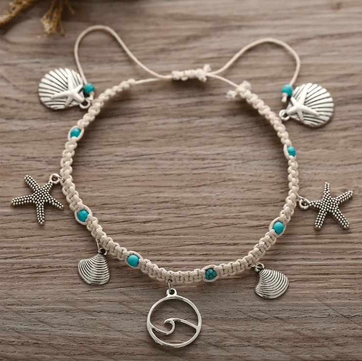 Produktedetails: Gehäkelte creme-weisse Fusskette mit diversen Anhängern wie Wellen Symbol, Muscheln und Seesternen. Fusskette in Einheitsgrösse, kann auch als Armband getragen werden.
