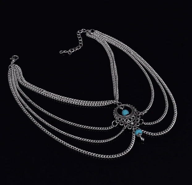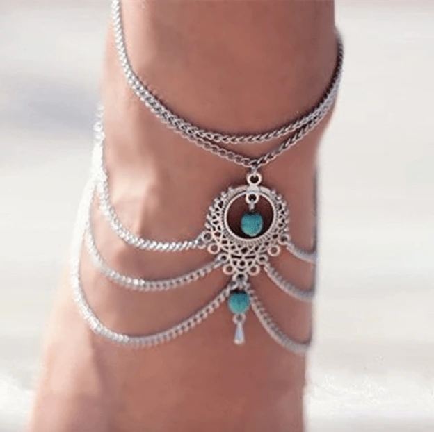 Produktdetails: Bohemian Fusskette mit schönem Muster und türkisem Stein. Kann auch als Oberarmkette oder Armkette getragen werden.