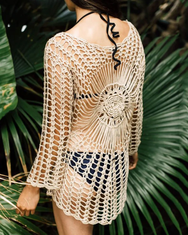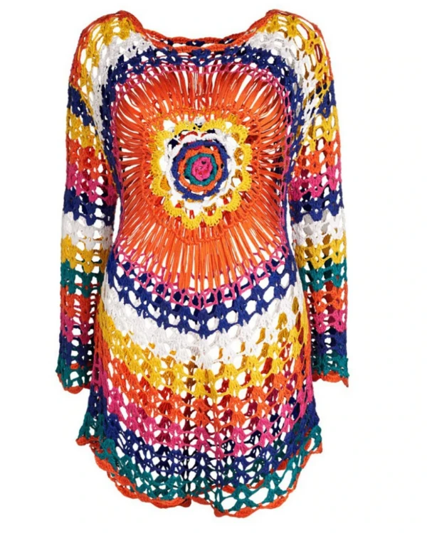 Produktdetails: Kurzes Häkelkleid im Crochet Knitted Style mit schönem Boho Muster. Farbiges Bohemian Häkelkleid, Strandkleid. Tunika Kleid für Damen im Hippie Style.