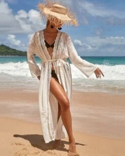 Produktdetails: Bodenlanger Spitzen Kimono Cardigan Damen mit Stoffgürtel zum binden. Eleganter weisser Boho Kimono Beach Cover Up. Sommer Strandkleider Kimonos mit Spitzen Details.