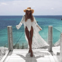 Produktdetails: Kimono / Cardigan mit Muster und Spitzen. Weisser Mesh transparenter Kimono mit langen Ärmeln. Boho Ibiza Style Strand Kimono Beachwear.