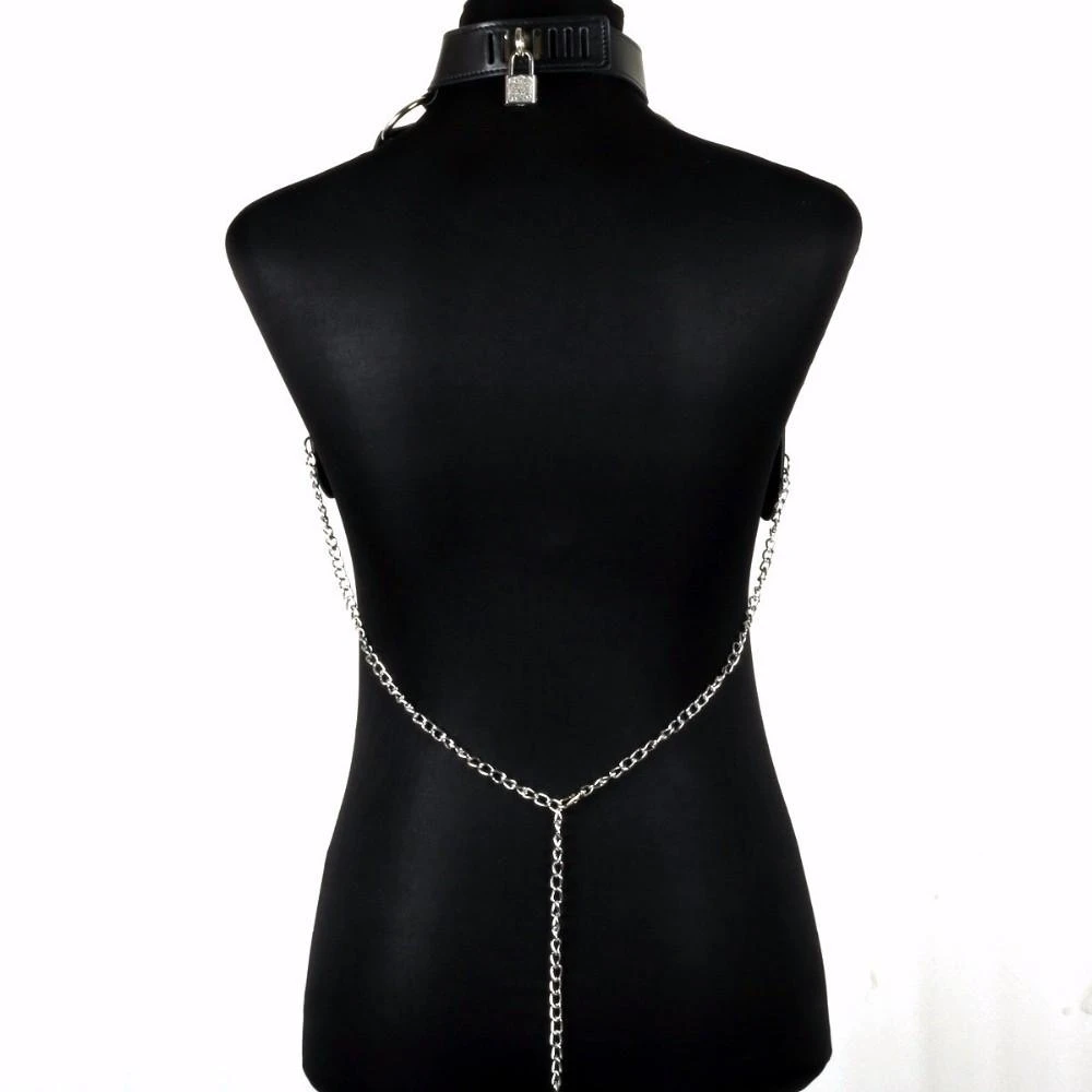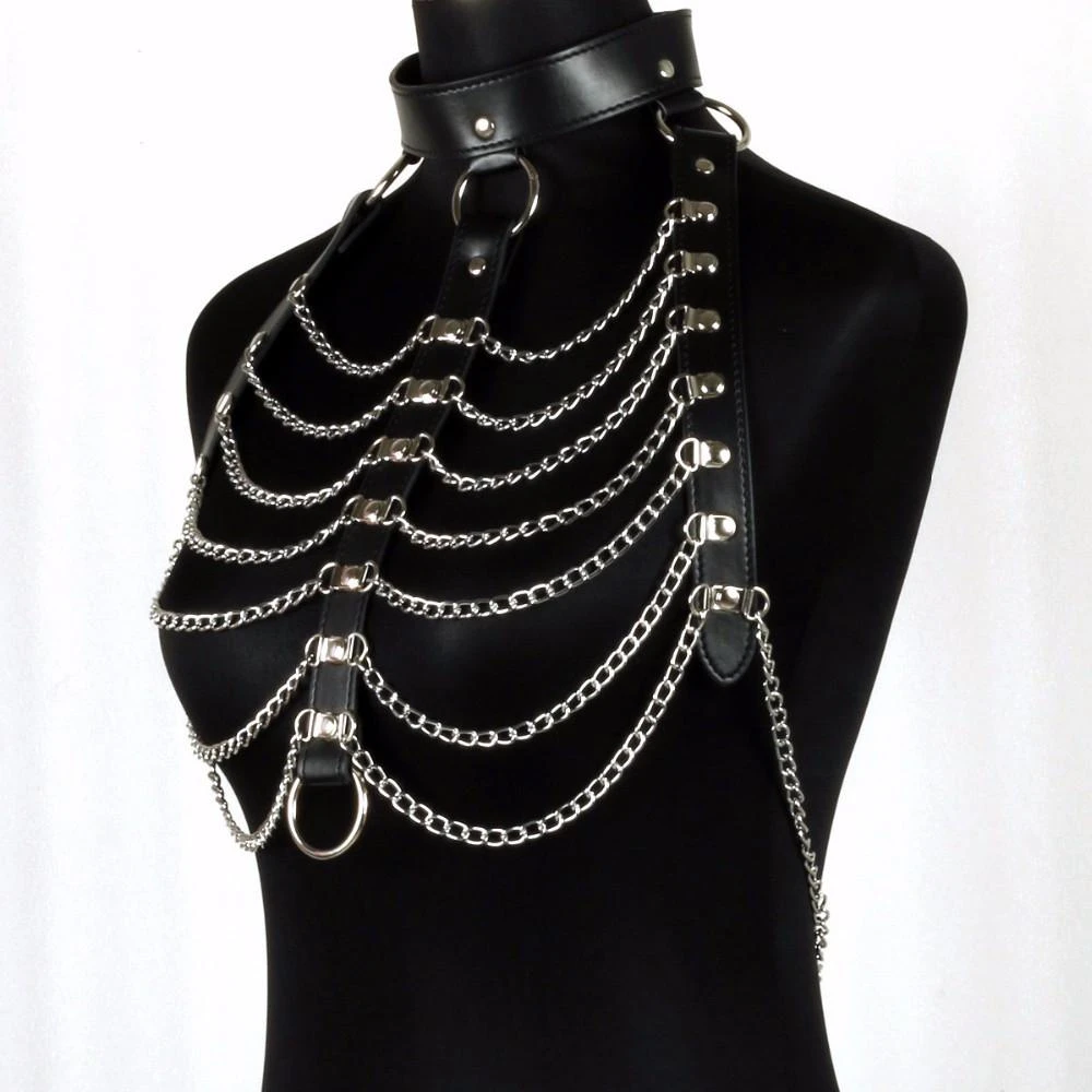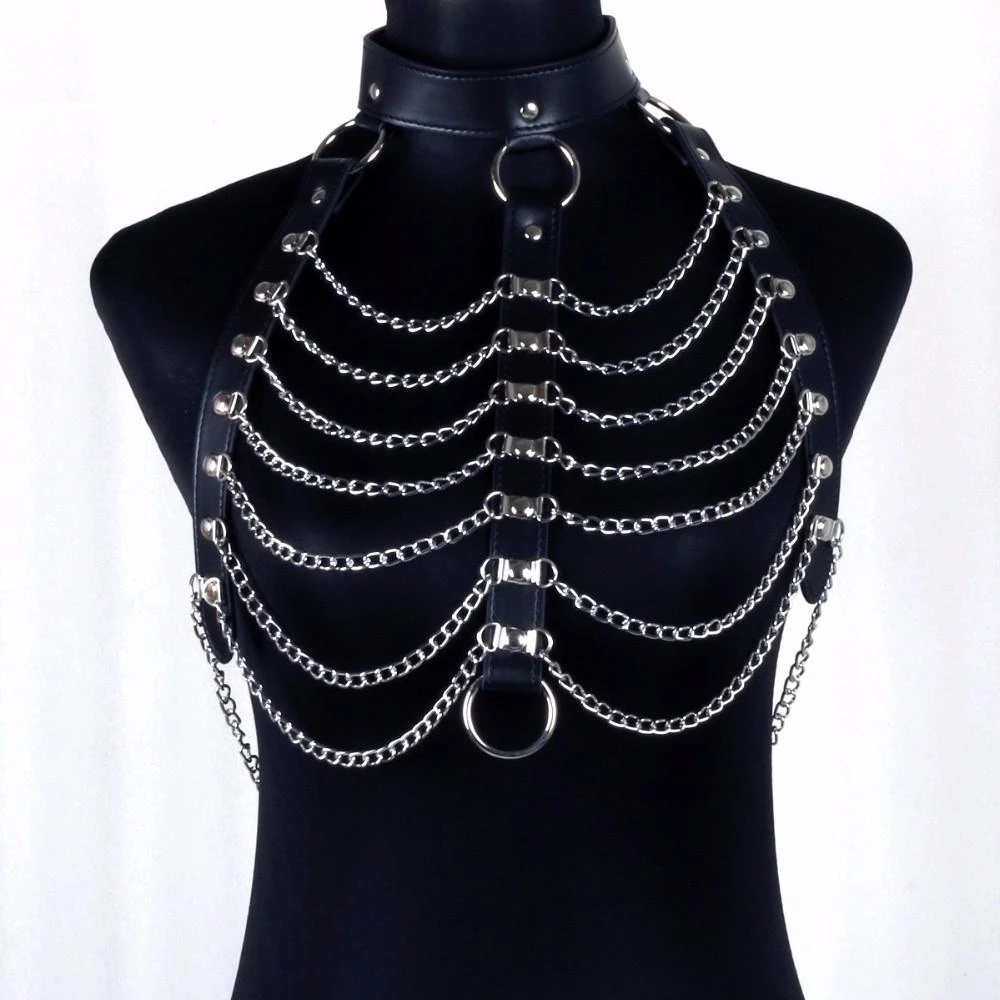 Produktdetails: Kunstleder Körpergürtel / Körpergeschirr mit Leichtmetall Ketten auf der Vorderseite. Rückenfrei und mit Choker Neckholder. Harness Festival Style Körpergürtel.