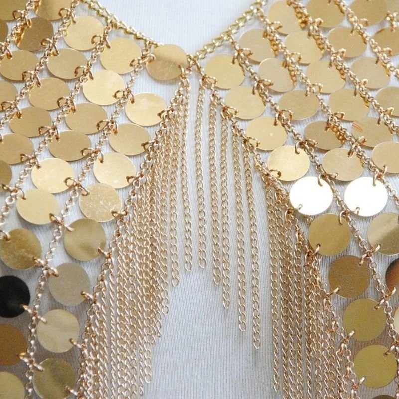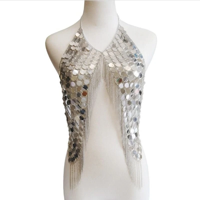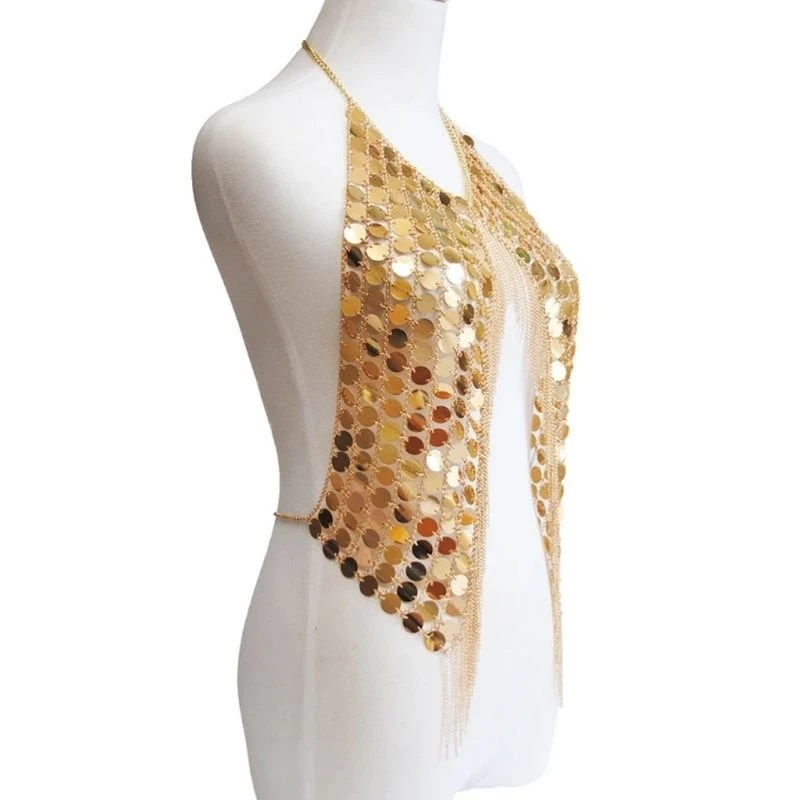 Produktdetails: Neckholder Körperschmuck aus vielen runden Plättchen und feinen Ketten. Asymmetrischer Körperschmuck der am Nacken befestigt wird und über die Brüste geht. Rückenfreier Festival Style Körper Schmuck Accessoires in gold und silber.