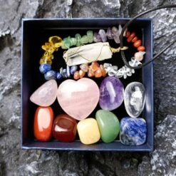 Set Inhalt: 1 x Klarer Quartz Halskette | 1 x Edelstein Armband in Chakra Farben | 9 x diverse Kraftvolle Edelsteine