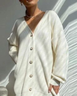 Produktdetails: Langer Damen Cardigan Strickjacke mit weitem V-Ausschnitt und Perlen Knöpfen auf der Vorderseite. Gestrickter Cardigan in lockerem weitem Schnitt perfekt zum rüber werfen. Kuscheliger Loungewear Cardigan aus geripptem Stoff mit schönen gold Perlen Knöpfen.