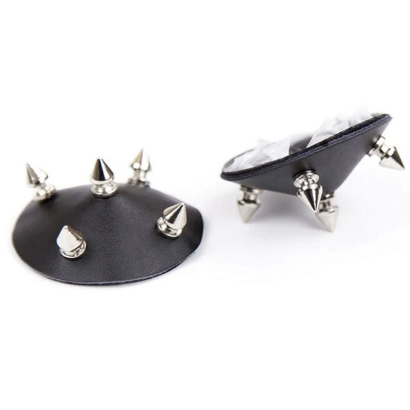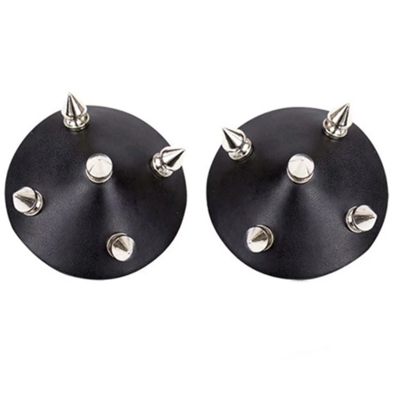 Produktdetails: Schwarzes Nippel Cover Set aus 2 x Nippel Sticker mit silbernen Nieten. Decke die Nippel / Brustwarzen der Brust mit Fetisch, etwas Punk Style, schwarzen Nipple Covers ab. Klebende Nippel Sticker für auf die Brustwarzen.