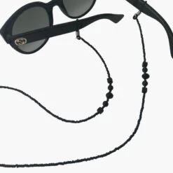 Produktdetails: Brillenkette aus schwarzen Kunstperlen. Trage deine Sonnenbrille oder Mundschutzmaske an einer stillvollen schwarzen Perlenkette. Mit dem Silikon Verschluss kann die Kette an jeder Brille befestigt werden.