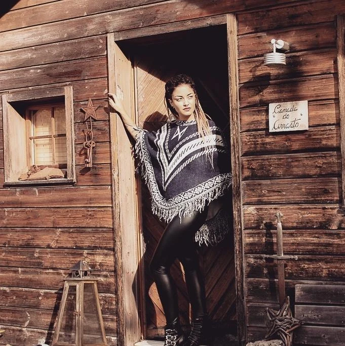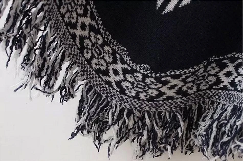 Produktdetails: Dicker und warmer Poncho Cape mit Ärmeln und Fransen. Super kuscheliger Damen Poncho mit Ethno Boho Mustern und rundem Kragen.