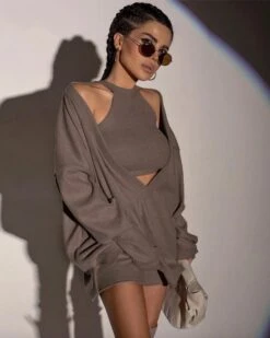 Produktdetails: Zweiteiler Set aus Oversized Pullover Sweater mit Neckholder Crop Top. Langes Oversize Pullover Kleid mit mit langem V-Ausschnitt auf der Vorderseite und passendem Crop Top für unter dem Pullover. Langarm Baumwolle Pullover Damen.