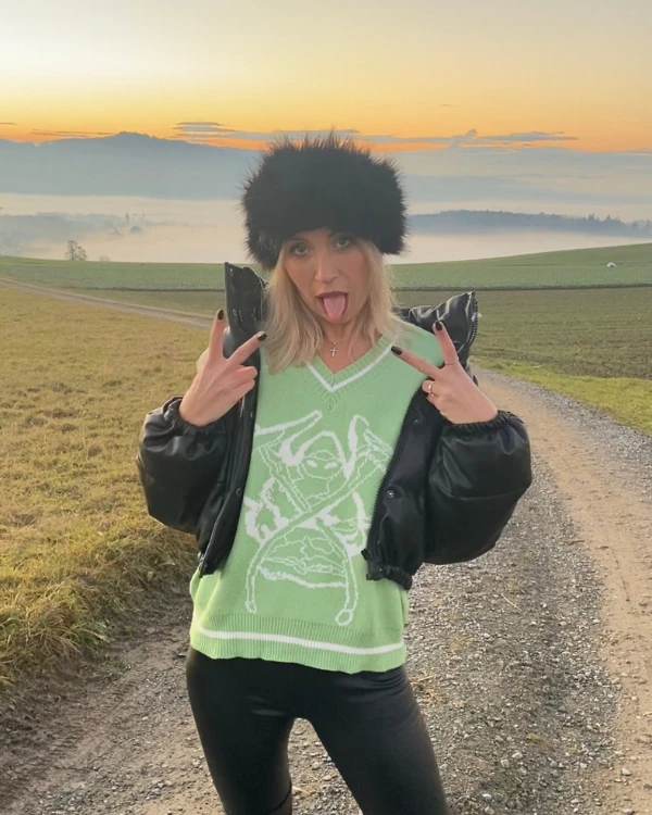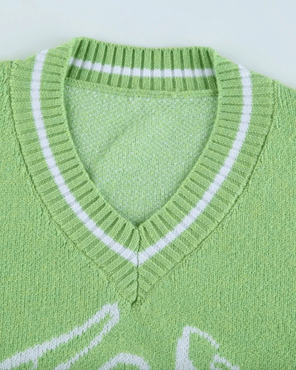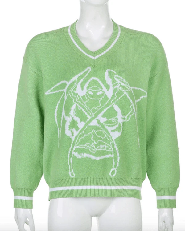 Produktdetails: Pullover mit Sensenmann Motiv in Skizze. Kuscheliger Damen Strickpullover mit V-Ausschnitt und weissem Aufdruck. Fashion Style Sweater hoher Qualität.