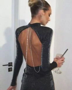 Produktdetails: Rückenfreies langarm Kleid mit Glitzer Ketten am Rücken und hohem Kragen. Elegantes Shine Kleid mit leichtem Glitzer Effekt. Cut-Out Bodycon Kleid eng anliegend.