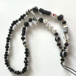 Produktdetails: Schwarze elegante Handykette aus Steinperlen mit Love Buchstaben und goldenen kleinen Perlen dazwischen. Stillvolle schwarze Handyketten für alle Smartphone Hüllen. Trage dein Handy einer schönen Handykette und verliere dein Telefon nicht mehr 😉