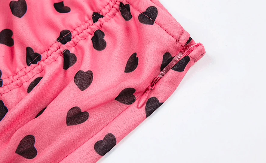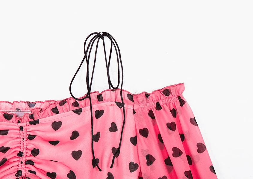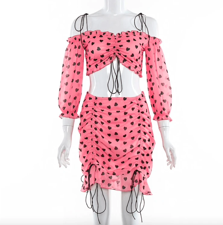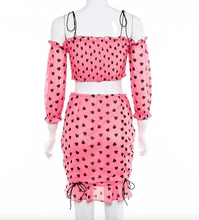- Produktdetails: 2er Set Ober- und Unterteil. Rock mit Reissverschluss auf der Seite und Fäden um den Rock einzustellen. Schulterfreies Oberteil mit schwarzen Herzchen Print.