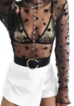 Produktdetails: Transparentes Shirt mit Sternen Print. Schwarzes langarm Mesh Shirt, perfekt als Festival Look.