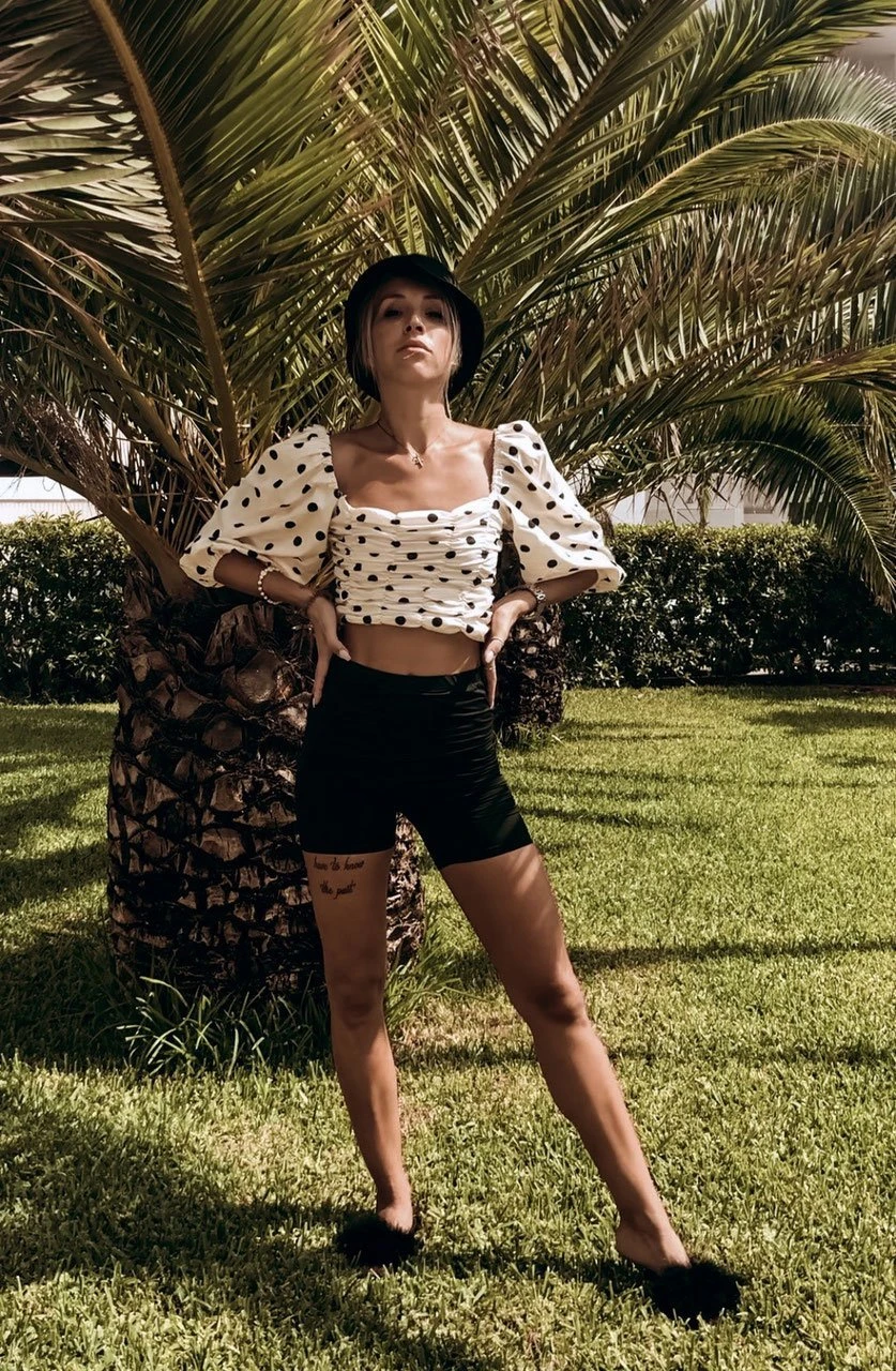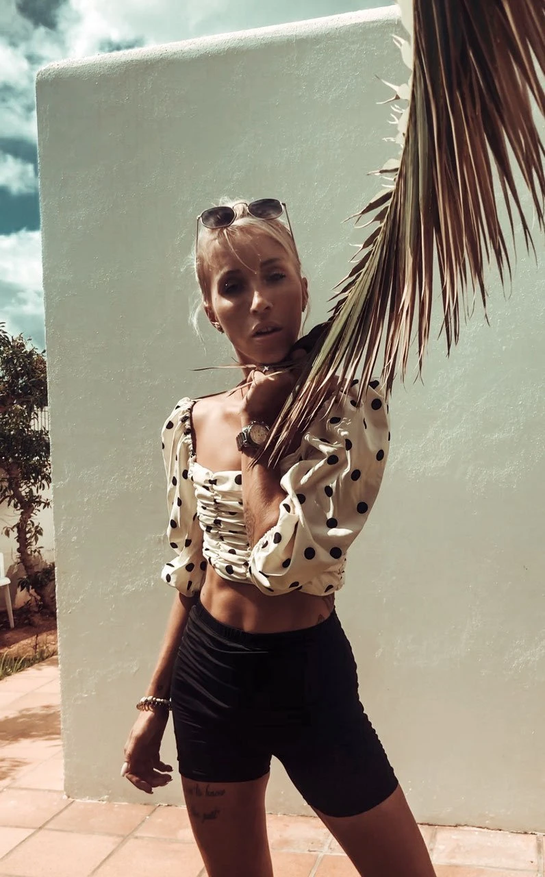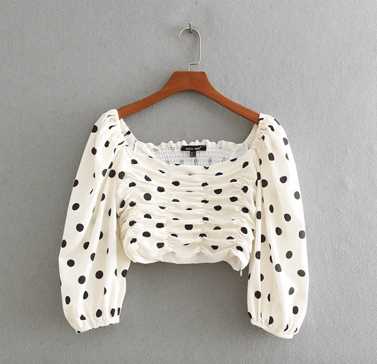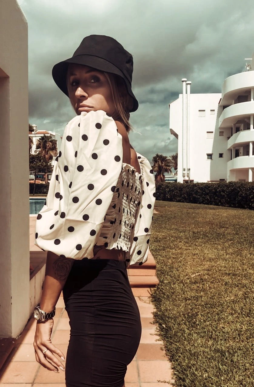 - Produktdetails: Shirt / Bluse mit hohen Schultern und schwarzen Punkten.