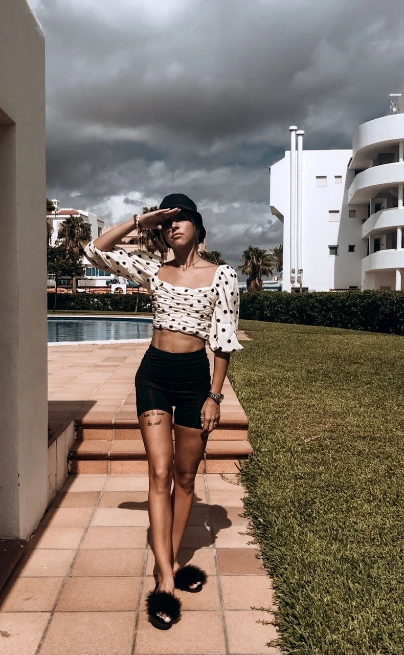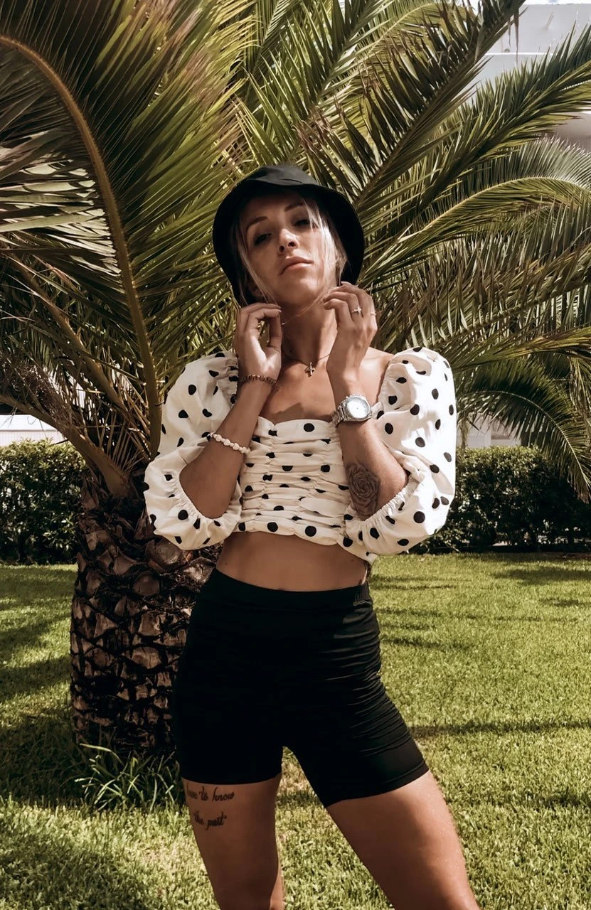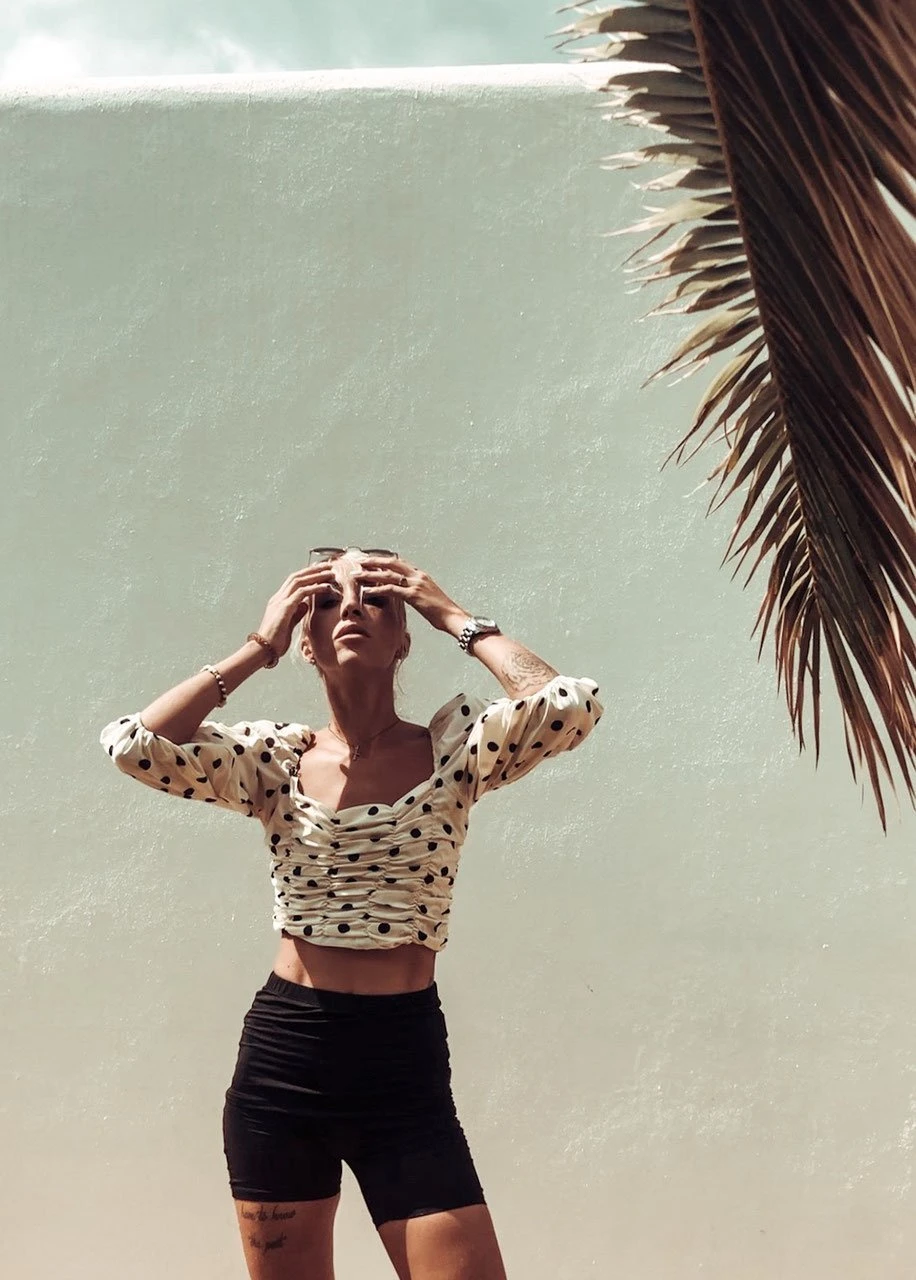 - Produktdetails: Shirt / Bluse mit hohen Schultern und schwarzen Punkten.
