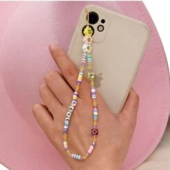 Produktdetails: Bunte verspielte Perlenkette für dein Handy Cover. Handykette aus gemischten farbigen Perlen mit Blumen Smileys Symbolen Perlen und Love Buchstaben. Handy Accessoires Kette in Flieder Rosa und Gelb Tönen gemischt.