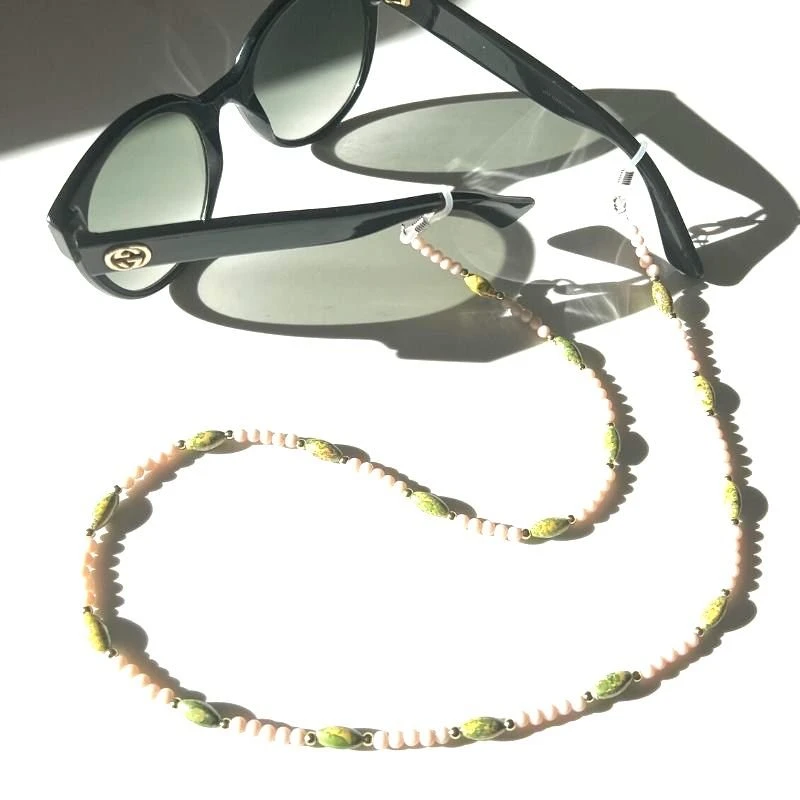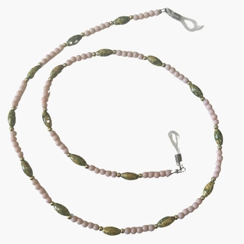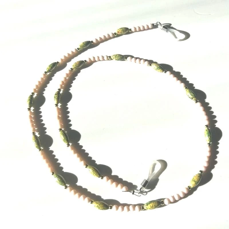Produktdetails: Schöne Brillenkette Perlenkette aus Rosa Kunstperlen mit grünen Stein Ähnlichen Perlen dazwischen. Boho Hippie Style Ketten Accessoires das als Brillenkette und Maskenkette getragen werden kann. Perlenkette mit Silikon Verschluss.