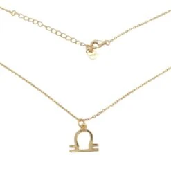 Produktdetails: Sterling Silber 925 Halskette vergoldet mit Waage Libra Zodiac Symbol Anhänger. Das grafische Symbol, das das Tierkreiszeichen Waage darstellt, erinnert an das ägyptische Symbol des Stahlhofs, ein Messinstrument, das ein Symbol des Gleichgewichts ist. Der untere Teil repräsentiert die Erde, während der obere die Erhebung des Geistes darstellt.